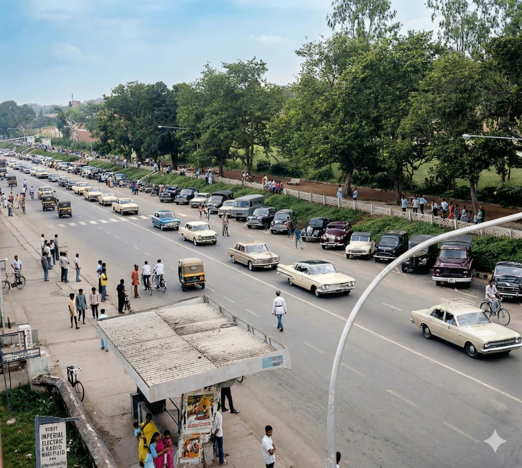 To the right of the frame lies the most painful loss for old-time Bangaloreans: the M.G. Road Boulevard. Before the Metro pillars took over, this was a lush, green promenade where people gathered to watch the world go by. The restoration from 1972 brings out the vibrant green of the canopy and the relaxed crowd lining the railing. It’s a Sunday morning scene that feels remarkably European, yet distinctly Bangalore.