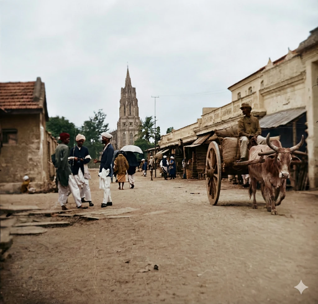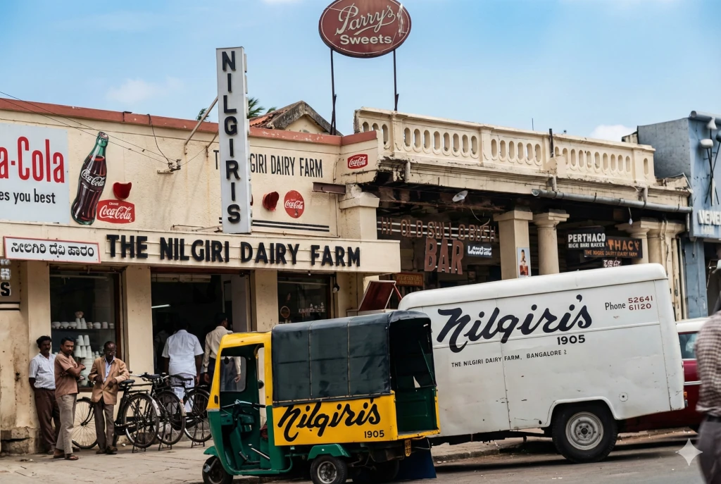 Before it was the supermarket giant we knew, it was the quaint ‘Nilgiri Dairy Farm.’ The AI colorization makes the old signage pop, and you can almost smell the fresh butter and bread through the screen. A nostalgic look at the shop in 1939 that introduced Bangalore to the joy of cake.
